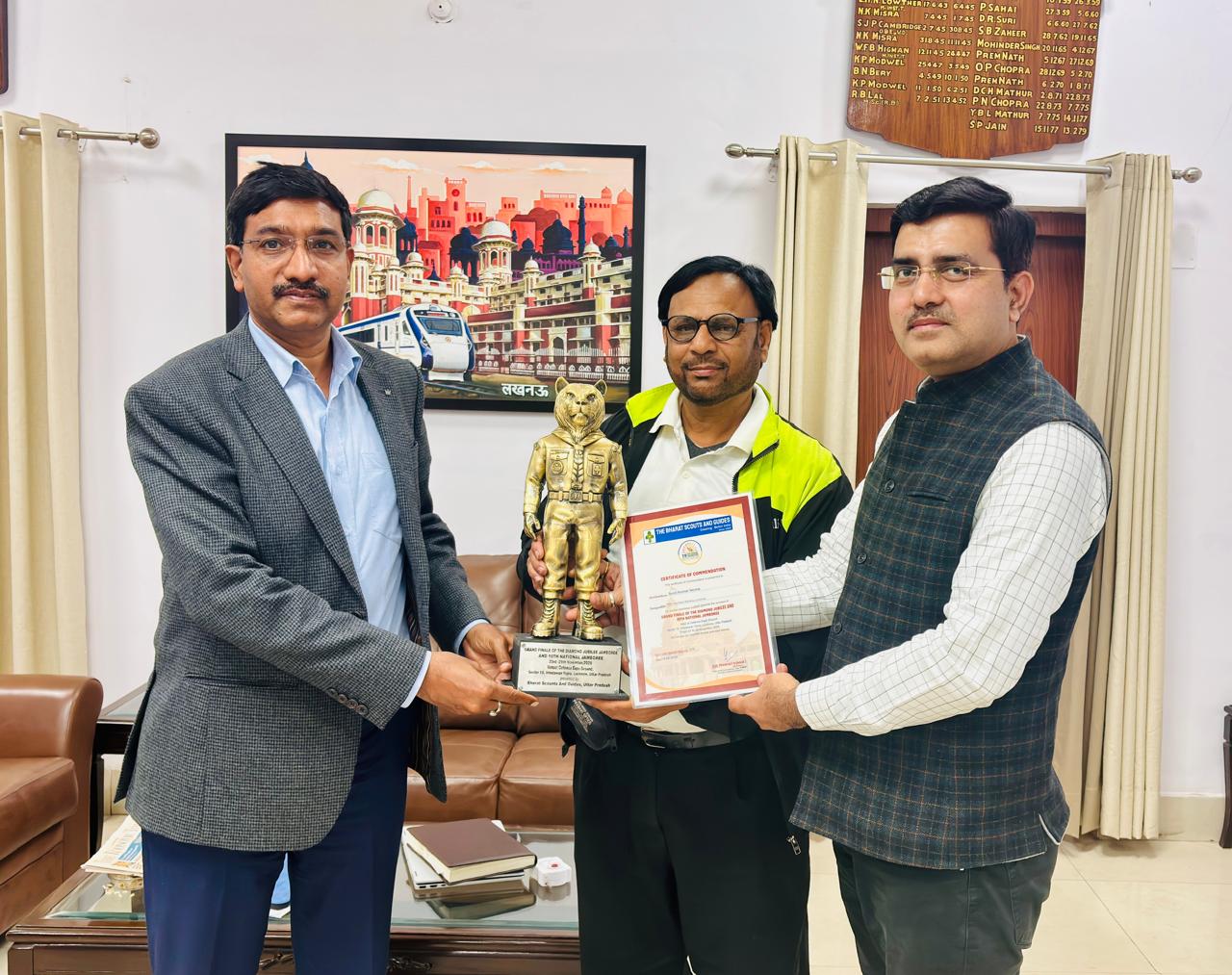 राजधानी के डिफेंस एक्सपो ग्राउंड में बीते साल 23 से 29 तक आयोजित 19वीं राष्ट्रीय स्काउट गाइड जंबूरी के दौरान देशभर से आए हजारों प्रतिभागियों के लिए सुरक्षित परिवहन की जिम्मेदारी उत्तर रेलवे, लखनऊ मंडल ने निभाई थी। इस विशाल आयोजन में विभिन्न राज्यों से आए स्काउट एवं गाइड प्रतिभागियों के आवागमन को सुनिश्चित करने में मंडल प्रशासन ने उत्कृष्ट कार्य किया। उत्तर रेलवे लखनऊ मंडल के डीआरएम सुनील कुमार वर्मा के नेतृत्व में सभी विभागों के अधिकारियों एवं कर्मचारियों ने बेहतर कार्ययोजना के तहत परिवहन व्यवस्था को क्रियान्वित किया। उत्कृष्ट कार्य के लिए शनिवार को बाबा साहेब भीमराव अम्बेडकर विश्वविद्यालय, साउथ सिटी, लखनऊ में आयोजित सम्मान समारोह में डॉ. महेंद्र सिंह, प्रदेश अध्यक्ष , स्काउट एंड गाइड, द्वारा उत्तर रेलवे , लखनऊ मण्डल को प्रशस्ति पत्र एवं शील्ड प्रदान कर सम्मानित किया गया।